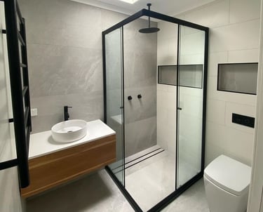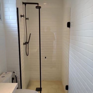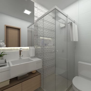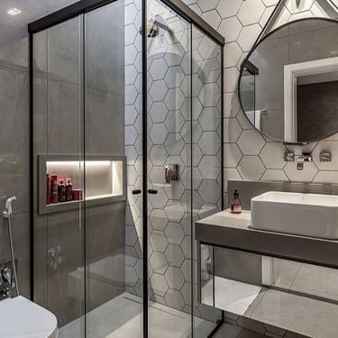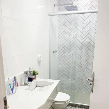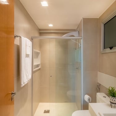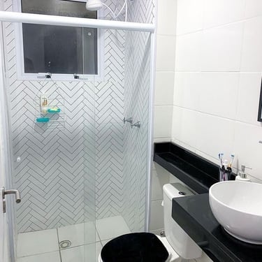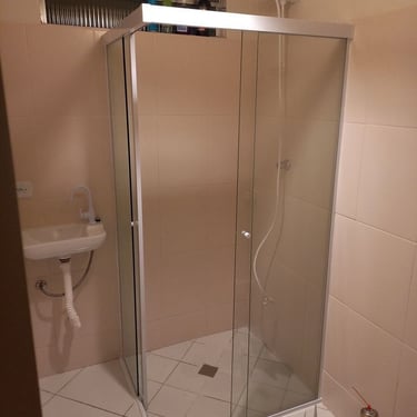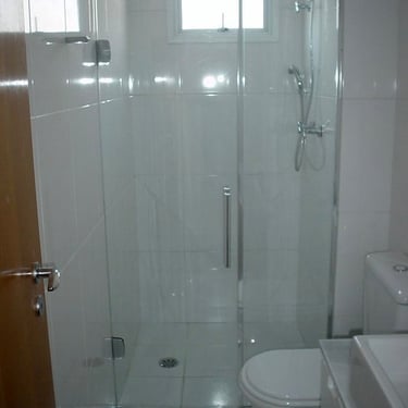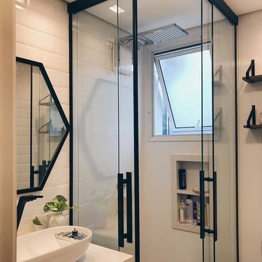O box de canto é ideal para otimizar espaços em banheiros menores, aproveitando bem os cantos e garantindo funcionalidade e conforto.